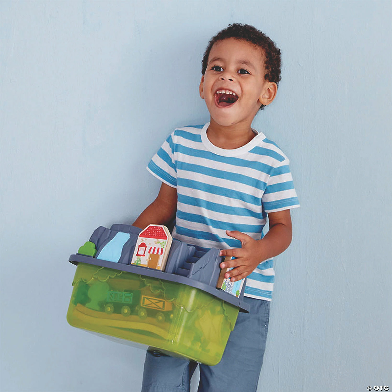 Kids will build a complete wooden train track with working crane, passengers, cargo, and more. This set includes everything you need for a full track and complete construction yard. With over 50 pieces, this set is the only one you’ll need to get kids having fun right away. Full of thoughtful details, this collection makes “let’s get a train set” easy and affordable! No need to buy multiple packs to complete your experience. Every piece has a purpose; the storage box becomes a green mountain pass, and the lid converts to a tiny town. This is a simple, classic toy re-imagined to maximize delight, and it’s won the awards to prove it.• Includes 1 free-wheeling locomotive, 2 carriages, 2 S-rails, 8 curved rails, 4 straight rails, 2 irregular rails, one mountain-shaped rails, pine trees, leafy trees and much more• Encourages imagination, problem solving, motor skills, and creative play• Dimensions: L: 19.7″, W: 31.5″; H 5.5″