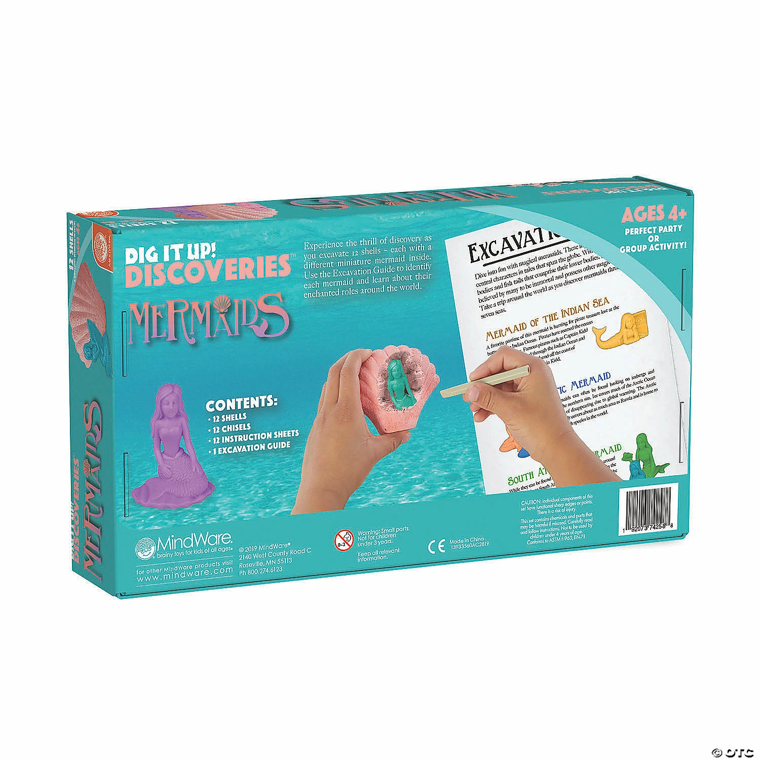 12 deep sea shells hide magical mermaids from all over the globe in this excavation activity. Once excavation is complete, learn about each mermaid’s special powers using the exploration guide. Simply soak the clay seashells in water, then carefully chisel away the sedimentary material to reveal the mermaids inside. • Each sea shell contains a different mermaid toy• Helps promote an early interest in science and imagination for kids• The perfect activity for parties and groups • 12 shells, chiseling tools and instructions