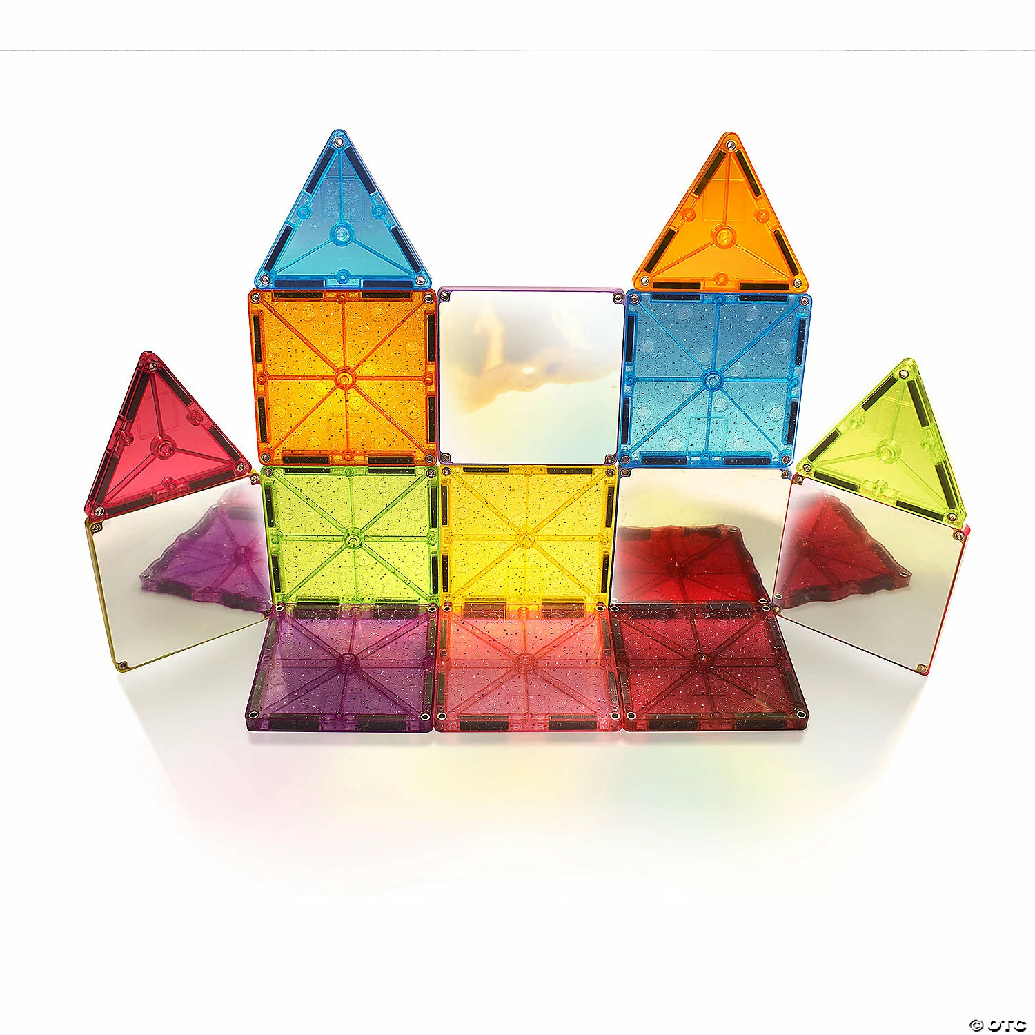 Build structures and create designs using these brightly colored magnetic tiles accented with mirrors and glitter. Magna-Tiles® can be used to create structures, but kids can also engage in open play with these colorful, shiny, glittery shapes. Make patterns, and designs on the floor, or use the magnets and create vertically on the fridge! This family-founded company has a heartfelt mission to help kids access simple, beautiful play as they discover more complex applications for the tiles. This is truly a toy that grows with your child, and provides hours of exploration and fun. • Magna-Tiles® Stardust set• Encourages free, creative play, develops math science, spatial and tactile skills• Includes 15 tiles; each shape has a base measurement of 3 inches