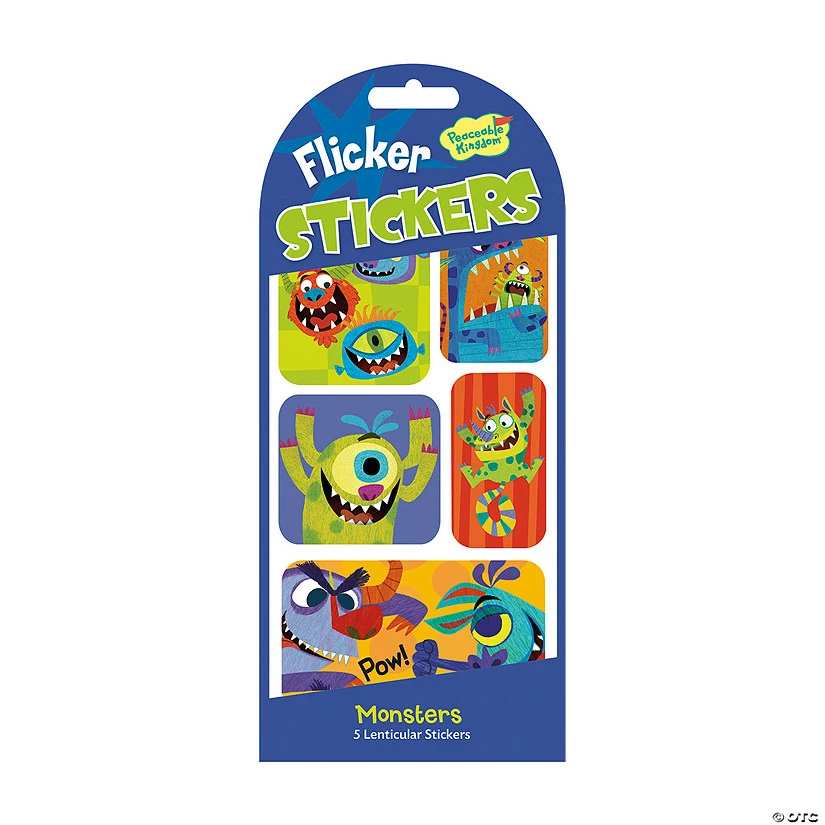 Adorable artwork make these sticker packs irresistible. Includes 12 identical packs of acid free stickers in monster designs. Each pack includes 1 sheet of flicker stickers with designs that appear to move as the sticker rotates. Each sheet measures 6″ x 3 3/4″.Age Recommendation: Ages 3 and up