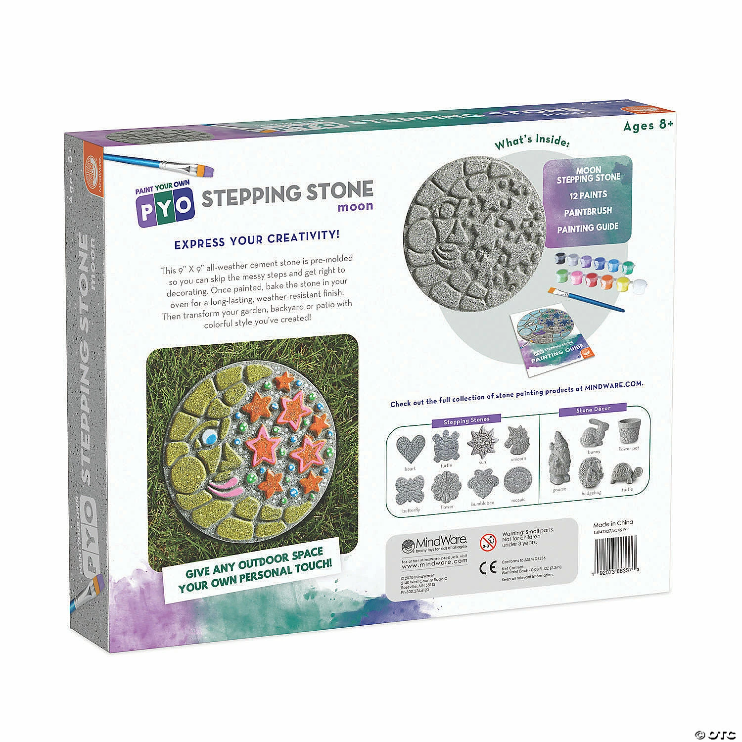 A dozen vibrant paints allow for endless creativity with Paint Your Own Stepping Stones—mix, blend and add custom color accents right out of the box – no cement mixing necessary! Once painted, bake the stone in your oven for a long-lasting, weather-resistant finish. Display this celestial stepping stone or make a whole pathway of colorful designs to transform your garden, backyard or patio! • Decorate your outdoor living space with color• Develops creativity, hand-eye coordination and color mixing skills• Weather-resistant finish once baked• Pairs well with PYO Stepping Stone Sun• Includes a 10″ x 9″ cement stepping stone, 12 paints, a paintbrush and instructions including a color planning template
