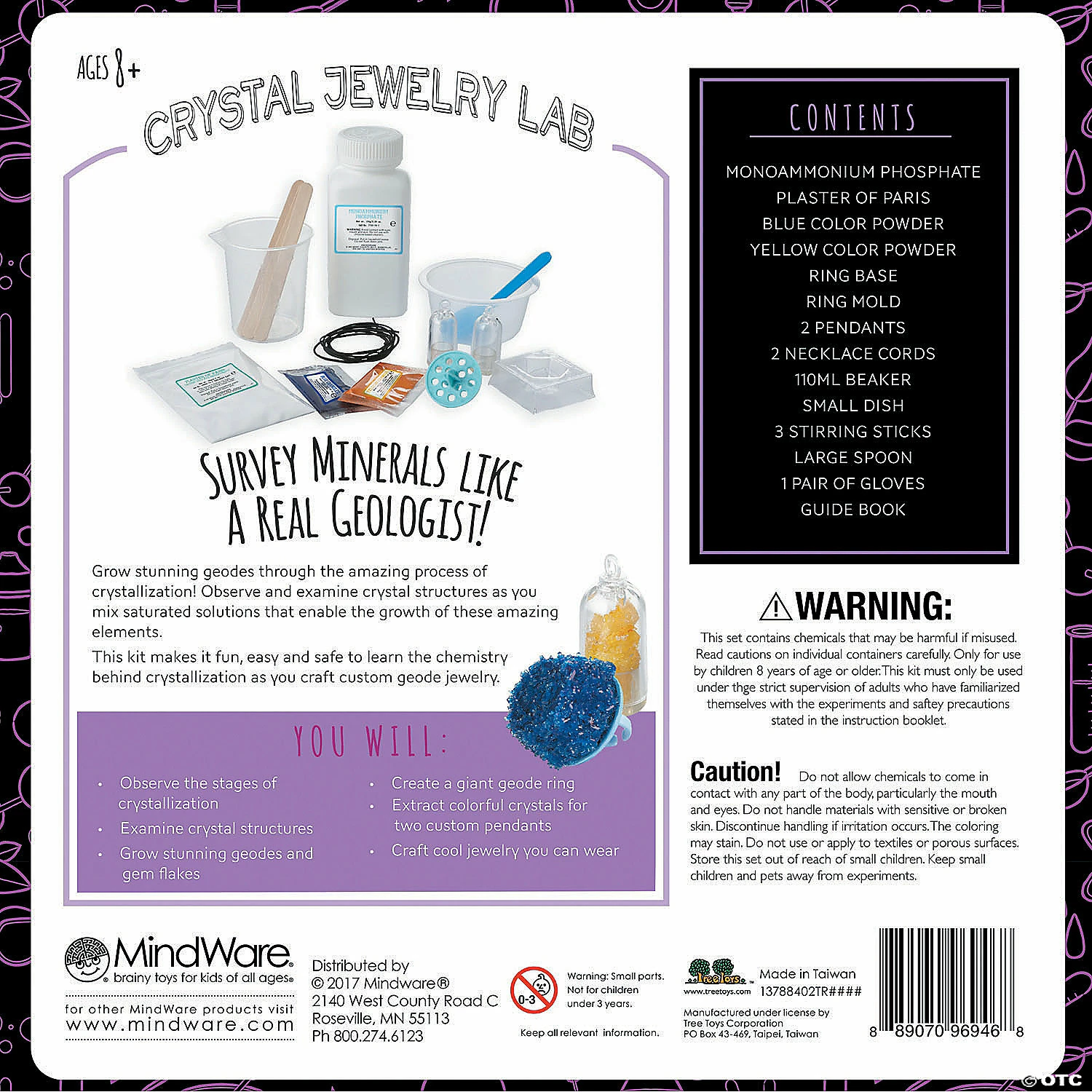 Do you have a curious kid who loves everything that sparkles? Some science experiments for kids shine brighter than the rest! Grow stunning geodes through the amazing process of crystallization with this brilliant lab activity. The kit includes all the science supplies needed, along with crystal clear, step-by-step instructions for dazzling gems worthy to be worn. Includes a ring and 2 pendant necklaces to display custom jewelry creations.• Create your own geode gem jewelry• A hands-on lesson in science for kids• Learn about the formation and growth of crystals• Includes a full-color instruction manual and supplies• Safety gloves are latex free