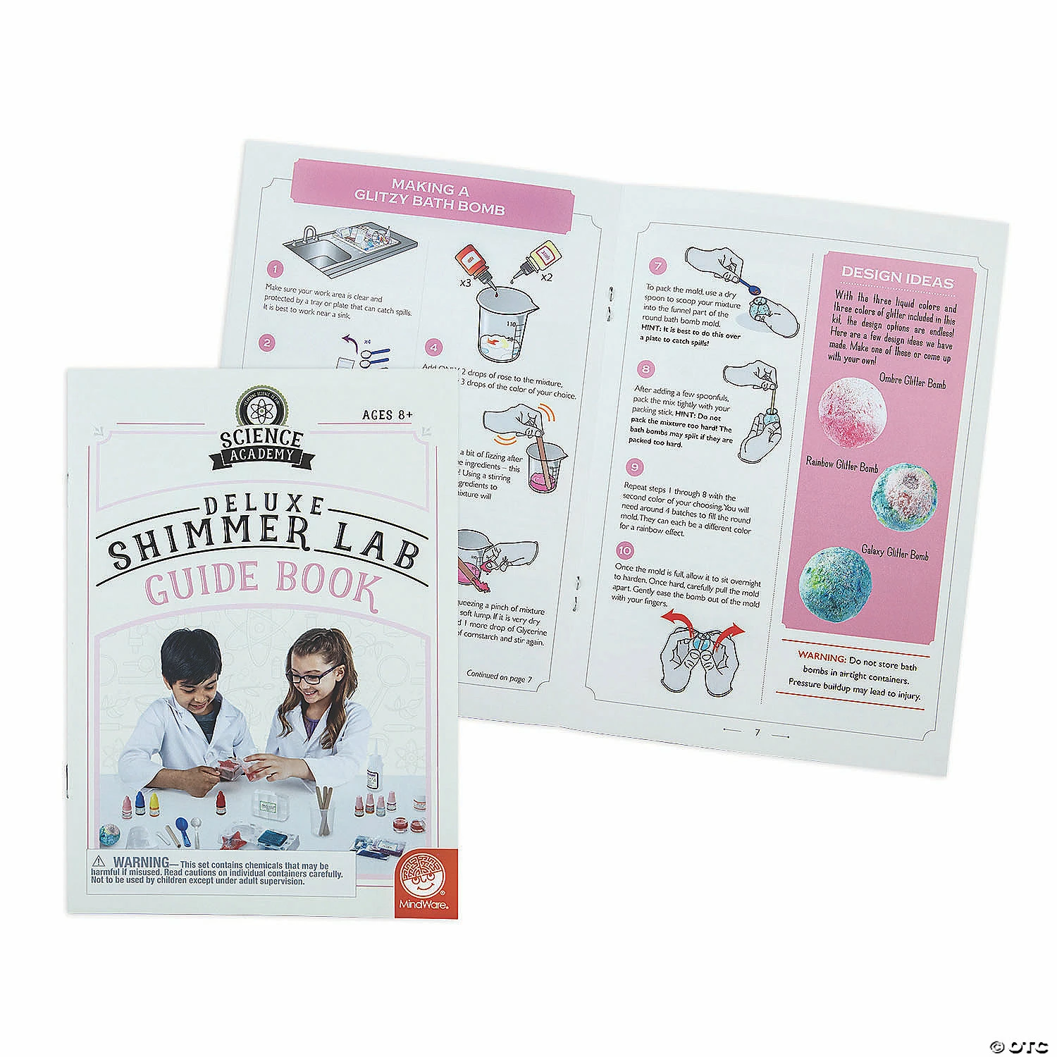 It’s sparkly spa science for kids curious about cosmetic chemistry! Uncover fun facts about fizz while you make glitzy bath bombs. Get the scientific scoop behind suds as you create glimmering soaps, including one ombre bar. You’ll even formulate a high-luster lip balm, just like a real cosmetic chemist. All of the fun science experiments in this chemistry kit are good, clean, super sparkly fun! Prepare to shimmer and shine as you strut your scientific smarts. Plus you can feel good knowing this lab kit is eco-friendly, with 100% biodegradable glitter! • Set up your own cosmetic chemistry lab and make your own sparkly soaps, bath bombs and lip balm!• Encourages an early interest in chemistry and spa science for kids. • Includes soap base, fragrance, red, yellow and blue coloring, sodium bicarbonate, citric acid, cornstach, glycerine, rose fragrance, beakers, soap molds, bath bomb mold, 3 colors of biodegradable glitter, mini spoons, stir sticks, packing stick, lip balm color, lip balm mica, soy ester, wax beads, mineral oil, small spoon, lip balm jar, safety gloves, and instruction guide.• Gluten free